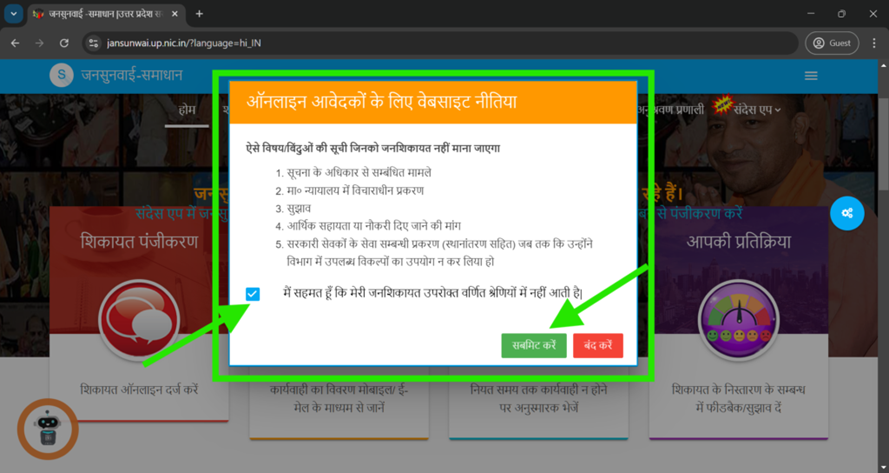 लॉगिन करें: जनसुनवाई IGRS वेबसाइट पर जाने के बाद, मुख्य पृष्ठ पर “शिकायत पंजीकरण” विकल्प पर क्लिक करें। यह सुनिश्चित करें कि आपकी शिकायत सूचीबद्ध श्रेणियों में नहीं आती। इसके लिए “मैं सहमत हूँ कि मेरी जनशिकायत उपरोक्त वर्णित श्रेणियों में नहीं आती है” विकल्प पर टिक करें। इसके बाद, “सबमिट करें” बटन पर क्लिक करें। इस प्रक्रिया के बाद आप अपनी शिकायत दर्ज करने के अगले चरण पर पहुंच जाएंगे, जहां आपको आवश्यक विवरण भरने और आगे की प्रक्रिया पूरी करनी होगी।