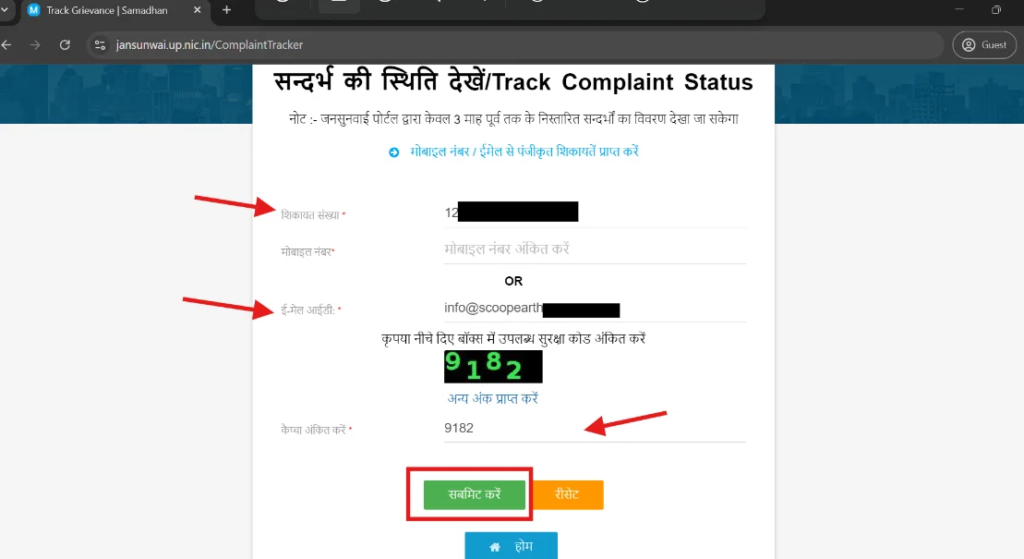 ये आपको “Track Grievance” वेबसाइट पर ले जाएगा। अब यहां पर आप अपनी “शिकायत संख्या” डालें, फिर “मोबाइल नंबर या ई-मेल आईडी” में से एक चीज़ भरें और कैप्चा अंकित करें। सभी जानकारी सही-सही भरने के बाद, “सबमिट” बटन पर क्लिक करें।