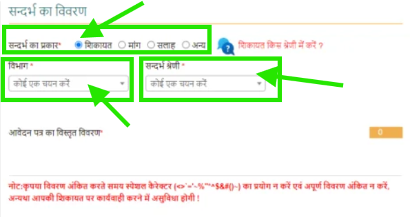 फॉर्म भरते समय, आपको उस विभाग का चयन करना होगा जिसमें आप अपनी शिकायत दर्ज करना चाहते हैं। इसके बाद, आपको अपनी शिकायत के प्रकार के बारे में विवरण दर्ज करना होगा, जिसमें आप अपनी समस्या या मुद्दे की स्पष्ट रूप से जानकारी देंगे।
