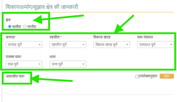 आपको पहले अपनी तहसील चुननी होगी, फिर विकास खंड का चयन करना होगा। इसके बाद, ग्राम पंचायत, राजस्व ग्राम, और थाना का चयन करना होगा। एक बार यह जानकारी भरने के बाद, आपको अपनी सभी संबंधित डिटेल्स दर्ज करनी होंगी। यह पूरी प्रक्रिया पूरी करने के बाद, आप फॉर्म के अगले चरण पर जा सकेंगे।